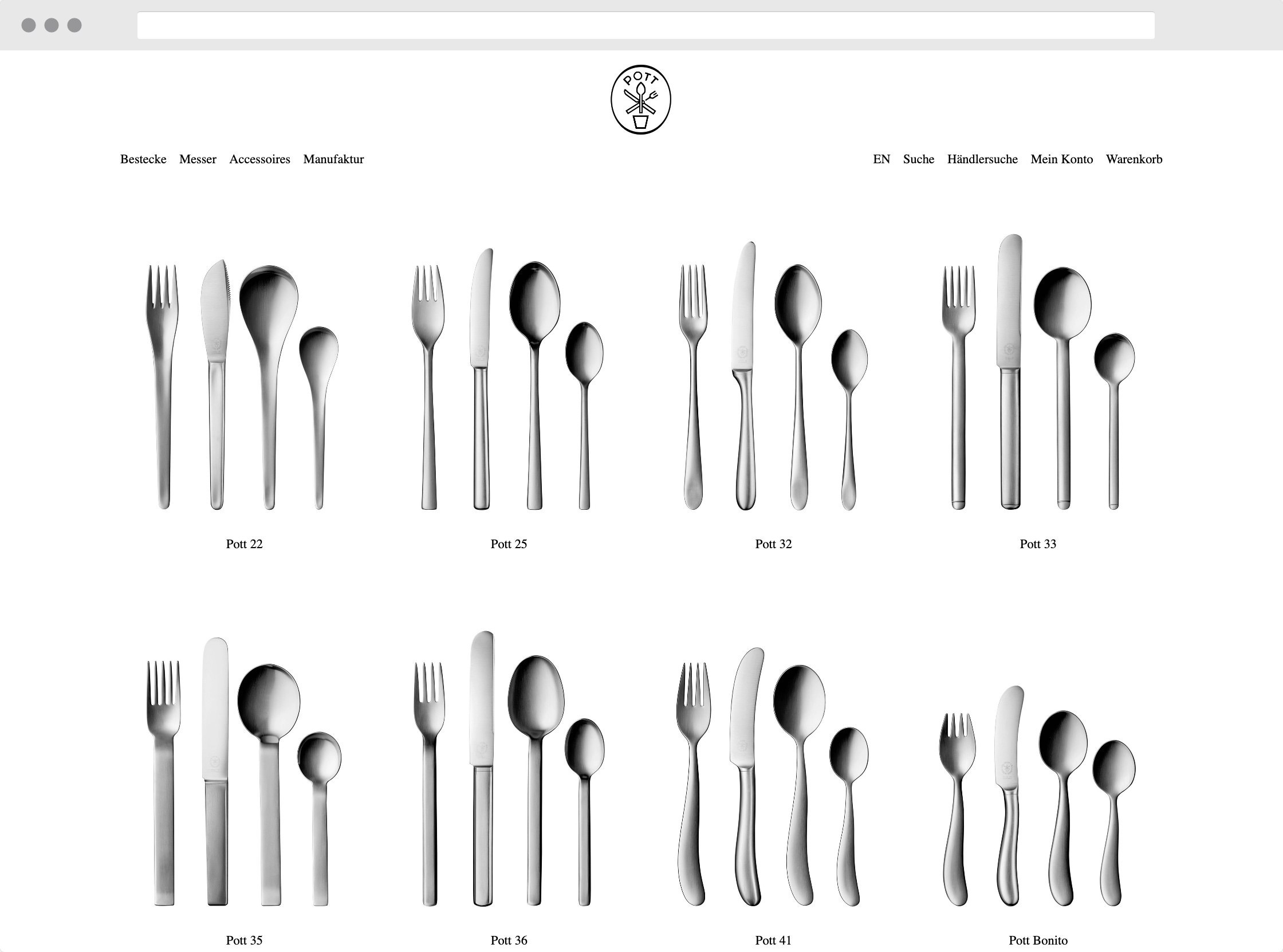 Wir haben für Pott Bestecke einen Shopware 6 Shop mit einem einzigartigen Template erstellt und eine Schnittstelle zu Microsoft Dynamics Navision entwickelt. Die kontinuierliche Wartung des Systems durch uns hält den Shop stets aktuell und sicher.